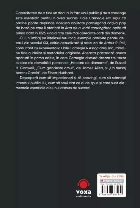 Capacitatea de a ține un discurs în fața unui public și de a convinge este esențială pentru a avea succes. Dale Carnegie era sigur că oricine poate deprinde această abilitate parcurgând câțiva pași de bază pe care îi prezintă în Arta de a vorbi convingător, apărută prima dată în 1926, una dintre cele mai apreciate cărți din domeniu.
